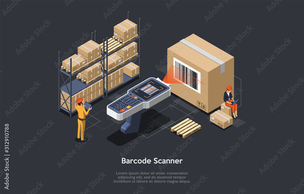 Isometric Warehouse Manager Or Warehouse Worker With Big Barcode Scanner Is Checking Goods Process Of Scanning Loading And Unloading Goods Stock Taking Job Vector Illustration Stock Vector Adobe Stock